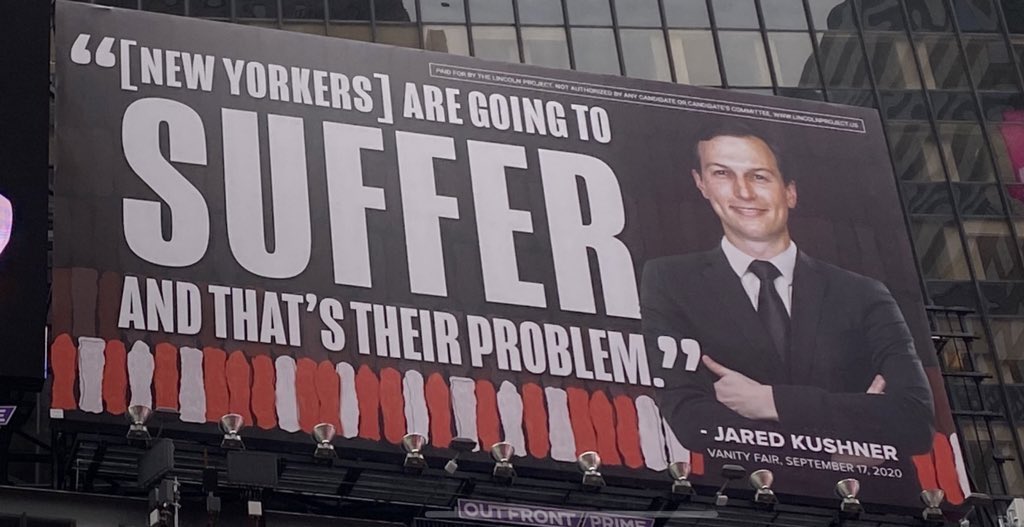Videos you watch may be added to the TVs. Two side-by-side giant billboards in Times Square have a message Ivanka and Jared dont care about the American people even during the coronavirus pandemic. Ivanka Trump and Jared Kushner are threatening to sue the Lincoln Project over billboards the anti-Trump group put up in Times Square assailing.