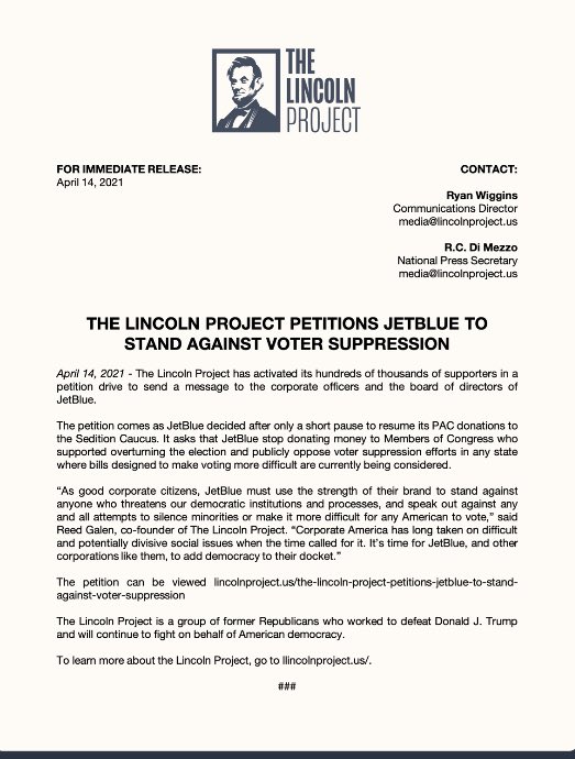 The Lincoln Project The Lincoln Project Petitions Jetblue To Stand Against Voter Suppression